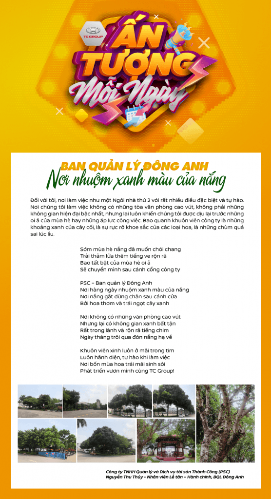Đối với tôi, nơi làm việc như một ngôi nhà thứ 2 với rất nhiều những điều đặc biệt và tự hào. Nơi chúng tôi làm việc không có những tòa văn phòng cao vút, không phải những không gian hiện đại bậc nhất, nhưng lại luôn khiến chúng tôi được dịu lại trước những oi ả của mùa hè hay những áp lực công việc. Bao quanh khuôn viên công ty là những khoảng xanh của cây cối, là sự rực rỡ khoe sắc của các loại hoa, là những chùm quả sai lúc lỉu.