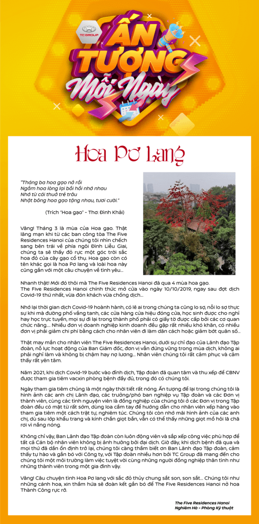Câu chuyện tình Hoa Pơ lang với sắc đỏ thủy chung sắt son, son sắt… Chúng tôi như những cánh hoa, xin thầm hứa sẽ đoàn kết gắn bó để The Five Residences Hanoi nở hoa Thành Công rực rỡ. Ngôi nhà thứ 2 trong trái tim tôi Khởi động triển khai Dự án Xây dựng Hệ thống Quản lý tuân thủ (CMS) tại TCG