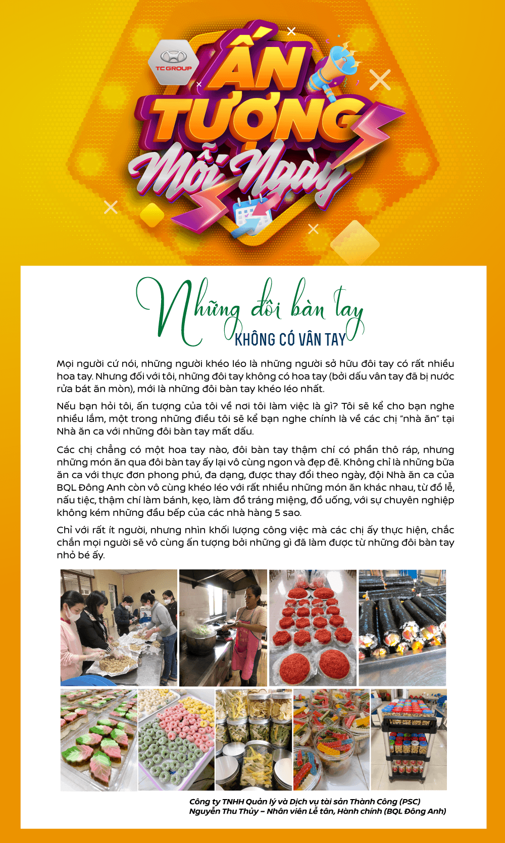 Các chị chẳng có một hoa tay nào, đôi bàn tay thậm chí có phần thô ráp, nhưng những món ăn qua đôi bàn tay ấy lại vô cùng ngon và đẹp đẽ. Không chỉ là những bữa ăn ca với thực đơn phong phú, đa dạng được thay đổi theo ngày, đội Nhà ăn ca của BQL Đông Anh còn vô cùng khéo léo với rất nhiều những món ăn khác nhau, từ đồ lễ, nấu tiệc, thậm chí làm bánh, kẹo, làm đồ tráng miệng, đồ uống, với sự chuyên nghiệp không kém những đầu bếp của các nhà hàng 5 sao.