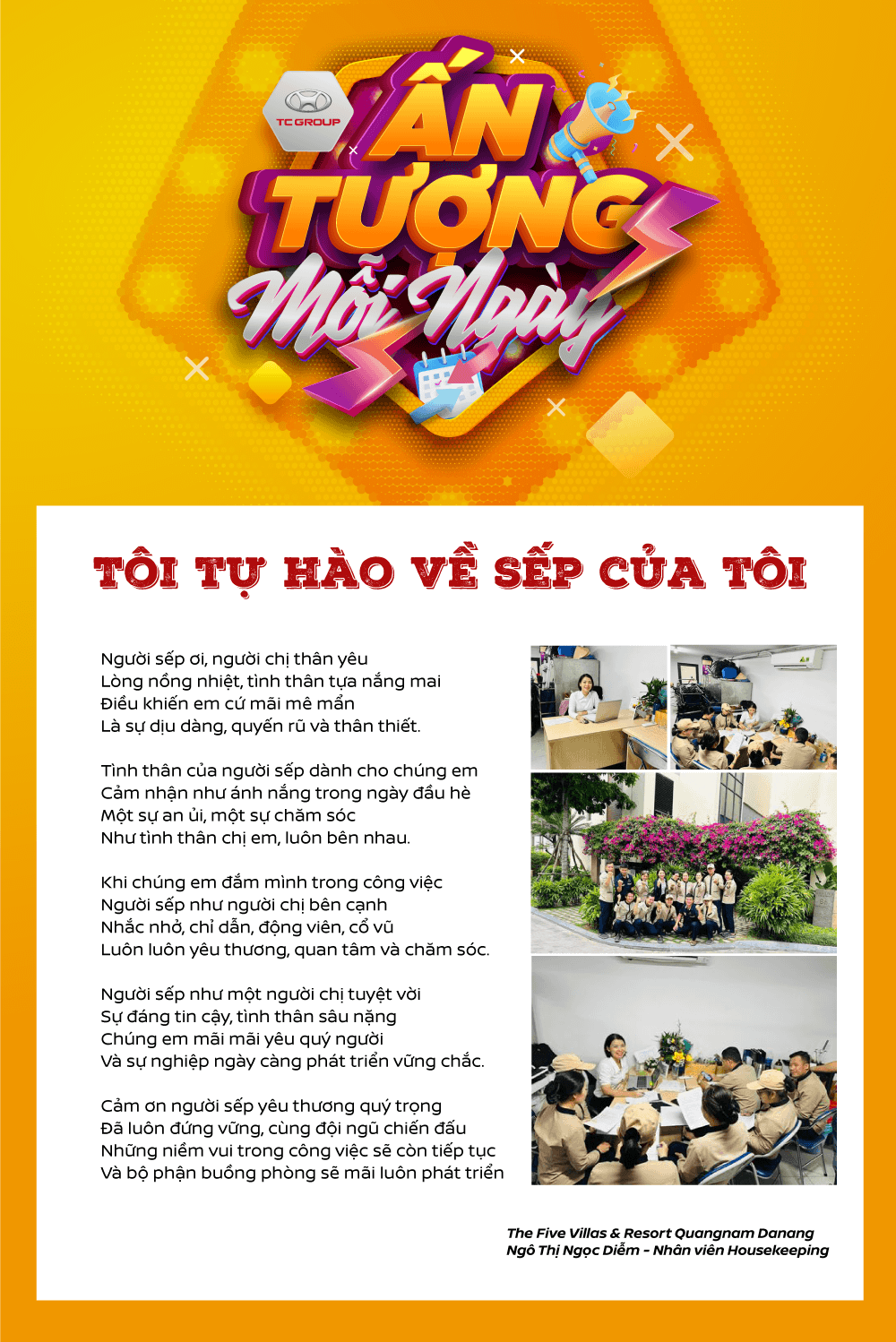 Cảm ơn người sếp yêu thương quý trọng Đã luôn đứng vững, cùng đội ngũ chiến đấu Những niềm vui trong công việc sẽ còn tiếp tục Và bộ phận buồng phòng sẽ mãi luôn phát triển Canteen TFVQD – Hành trình mỹ vị HTCV siết chặt đào tạo chuyên sâu hệ thống Phanh, Treo, Lái trên xe tải nặng