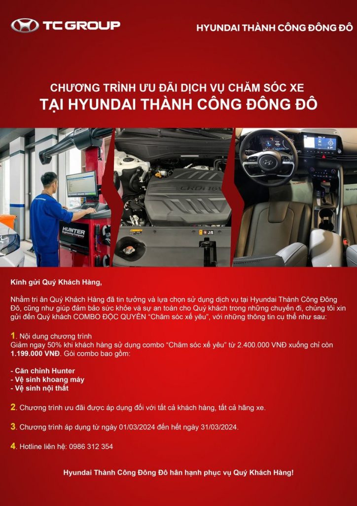 Để duy trì tuổi thọ cũng như đảm bảo cho “xế cưng” luôn trong tình trạng “mạnh khỏe”, sẵn sàng đồng hành cùng chủ nhân chinh phục mọi nẻo đường an toàn và thoải mái nhất, chăm sóc xe hơi là một công việc quan trọng mà mọi chủ xe đều quan tâm. Chính vì vậy, Hyundai Đông Đô mang đến cho Quý khách hàng nói chung, CBNV TC Group nói riêng rất nhiều chương trình ưu đãi khi bảo dưỡng xe.