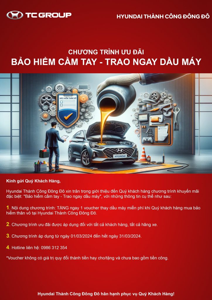 - Khi mua bảo hiểm thân vỏ tại Hyundai Đông Đô, khách hàng sẽ được tặng ngay 01 voucher thay dầu máy miễn phí.