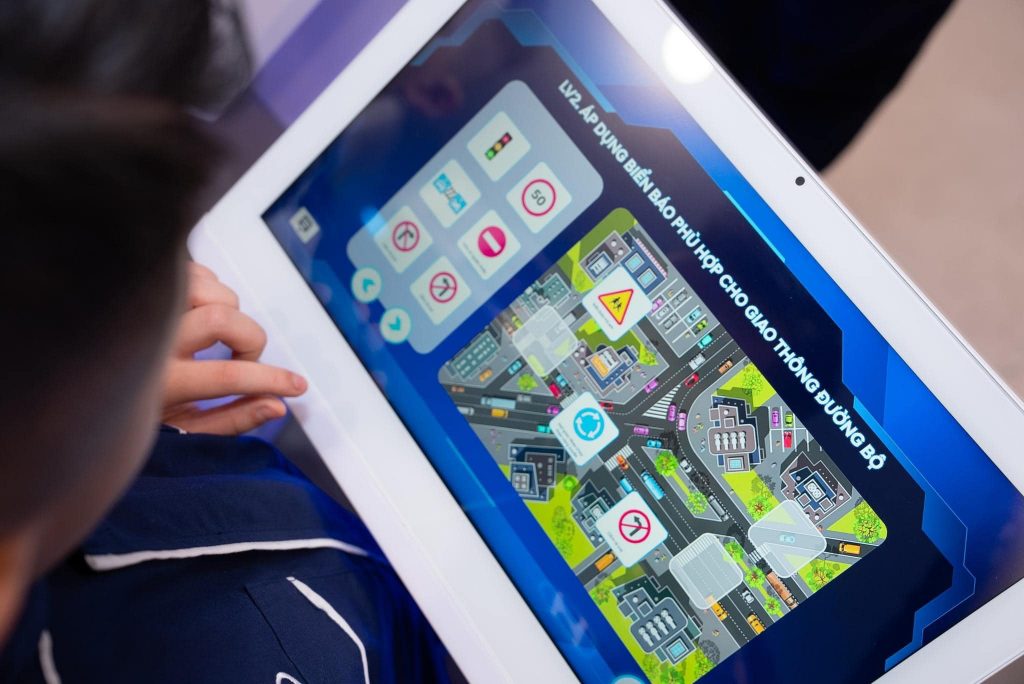 Các kĩ sư nhí chăm chú học về luật an toàn giao thông.