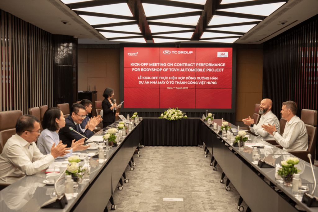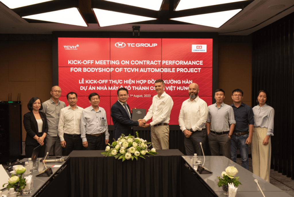 Lễ kick-off thực hiện hợp đồng Xưởng hàn Dự án Nhà máy ô tô Thành Công Việt Hưng là giai đoạn tiếp theo của của quá trình hợp tác giữa Công ty Cổ phần KCN Tổ hợp công nghệ Thành Công Việt Hưng và Tập đoàn Chropynska trong việc cung cấp và lắp đặt dây chuyền thiết bị bên trong Xưởng hàn đã được ký kết vào ngày 14/06/2023.