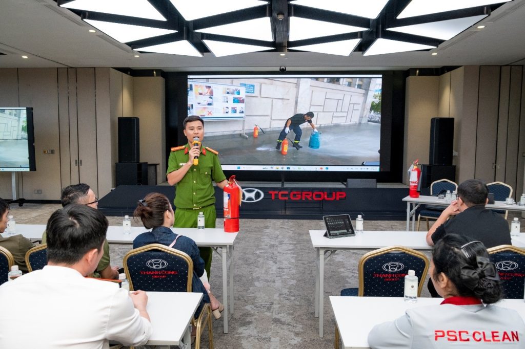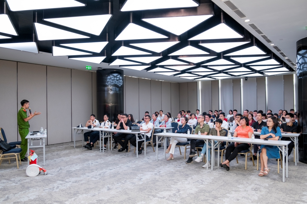 Buổi huấn luyện được triển khai theo hai phần chính: lý thuyết và thực hành. Ở phần lý thuyết, học viên được cán bộ Phòng Cảnh sát PCCC & CNCH (PC07) phổ biến những kiến thức cơ bản về công tác phòng cháy, nguyên nhân thường dẫn đến cháy nổ trong tòa nhà cao tầng, cách nhận biết và xử lý các tình huống nguy hiểm. Nội dung còn tập trung vào việc hướng dẫn sử dụng các trang thiết bị chữa cháy ban đầu như bình bột, bình CO₂, hệ thống họng nước chữa cháy vách tường, cũng như các thao tác kỹ thuật đảm bảo an toàn cho bản thân và người xung quanh. Đây là nền tảng quan trọng giúp học viên hiểu rõ vai trò, nhiệm vụ của mình khi có sự cố xảy ra.