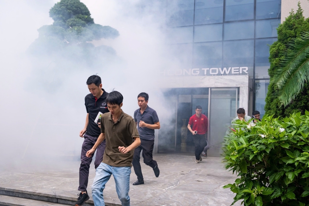 Điểm nhấn của buổi diễn tập là sự phối hợp nhịp nhàng giữa lực lượng PCCC cơ sở của hai tòa nhà và đơn vị nghiệp vụ chuyên trách. Mỗi học viên đều thể hiện tinh thần trách nhiệm, bình tĩnh xử lý tình huống theo đúng quy trình. Các thao tác như cắt điện khu vực cháy, đóng – mở hệ thống van nước, triển khai vòi chữa cháy, cũng như hướng dẫn cán bộ nhân viên thoát hiểm qua cầu thang bộ đều được thực hiện khẩn trương và an toàn.