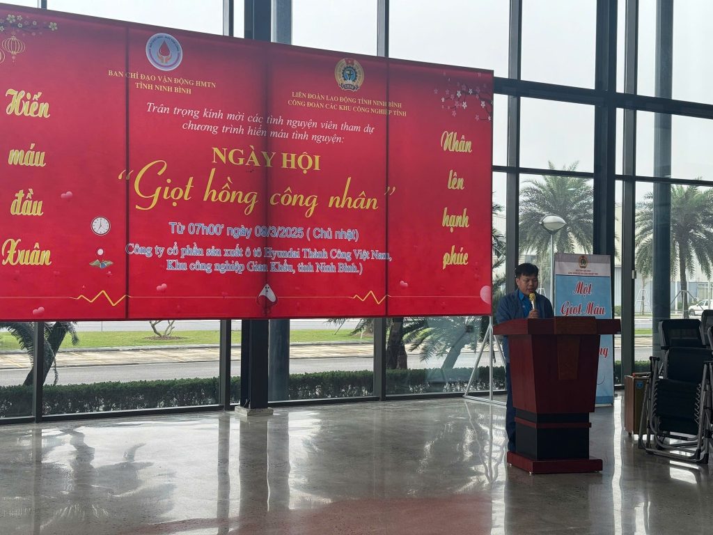 Ngày 9/3, Chương trình “Giọt hồng công nhân” được tổ chức tại Công ty Cổ phần Sản xuất ô tô Hyunda Thành Công (Khu công nghiệp Gián Khẩu, tỉnh Ninh Bình) đã thu hút sự tham gia của hơn 400 cán bộ công đoàn, đoàn viên và người lao động. Đông đảo CBCNV của HTMV đã hăng hái tham gia chương trình hiến máu và chia sẻ tinh thần vì cộng đồng.