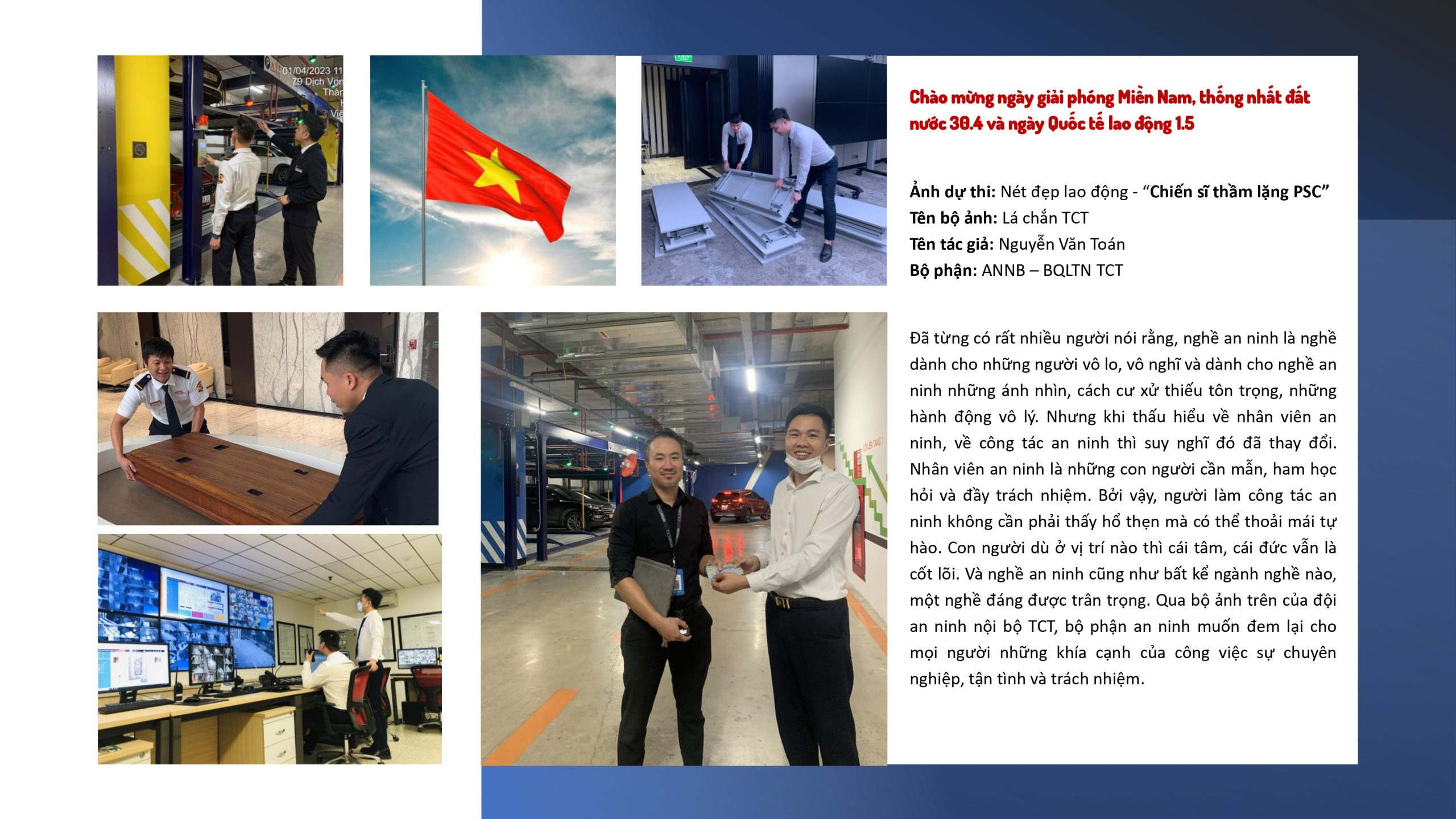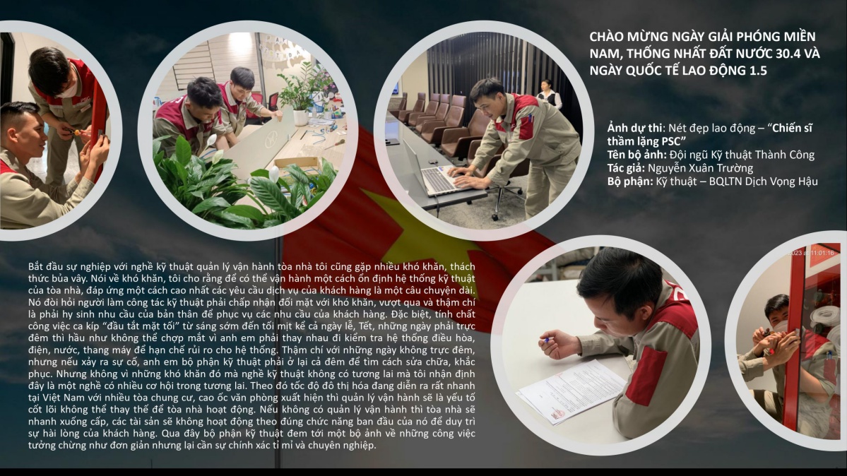 Để Chào mừng Ngày Giải phóng hoàn toàn Miền Nam, thống nhất đất nước 30/4 và Ngày Quốc tế Lao động 1/5, Công ty TNHH Quản lý và Dịch vụ tài sản Thành Công (PSC) phát động chương trình thi ảnh: Nét đẹp lao động với Chủ đề: “Chiến sĩ thầm lặng PSC” nhằm ghi lại những hình ảnh chân thực, gần gũi về chân dung CBNV và những nét đẹp trong đời sống lao động, công việc hàng ngày.