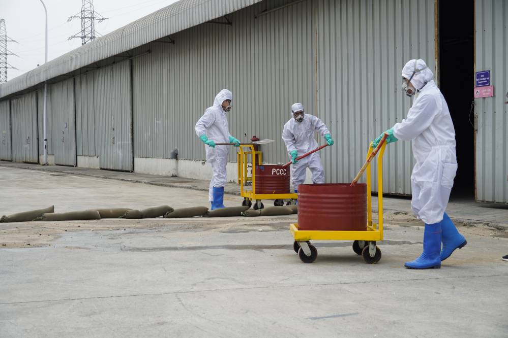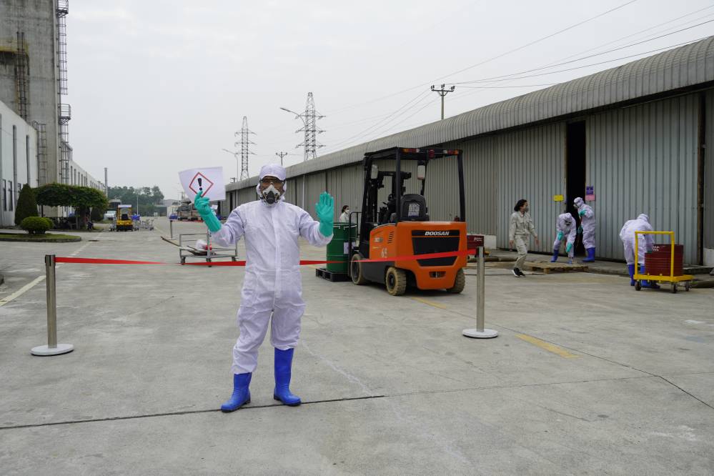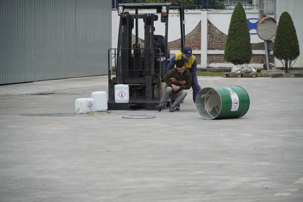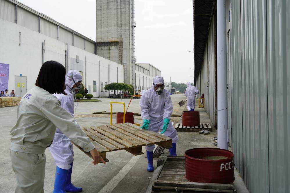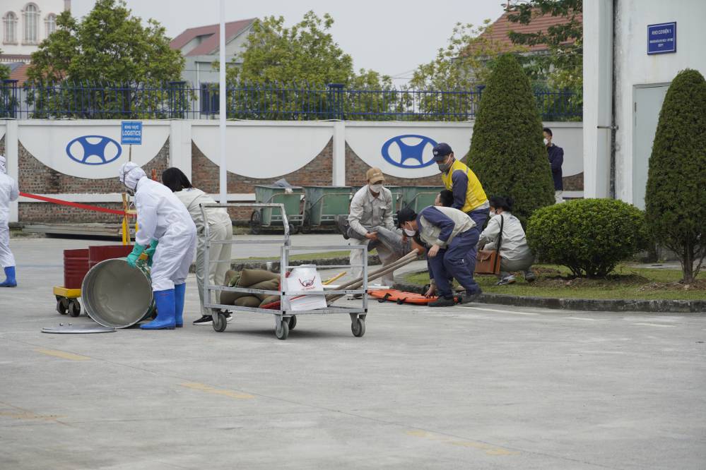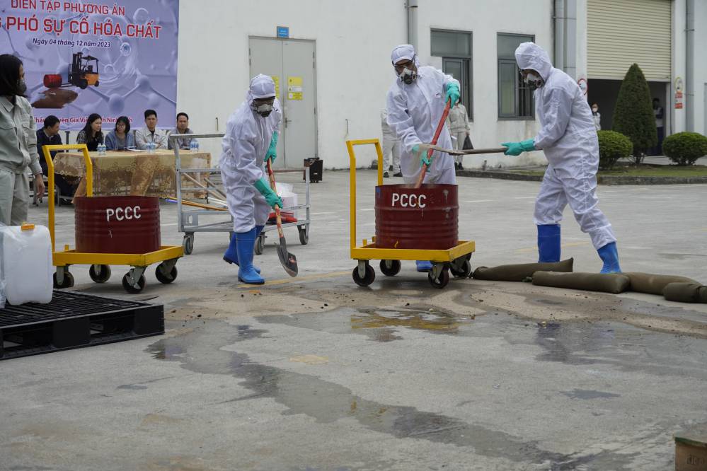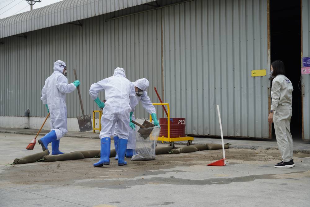 Buổi đào tạo và diễn tập ƯPSCHC được tổ ở bên ngoài xưởng Sơn. Nội dung buổi diễn tập mô tả tình huống sự cố tai nạn gây tràn đổ hóa chất trên đường vận chuyển. Khi tình huống giả định có sự cố xảy ra, ngay lập tức đội ƯPSC của công ty đã có mặt kịp thời, khoanh vùng khu vực, sơ cấp cứu cho người bị nạn; và tiến hành khắc phục sự cố tràn đổ.