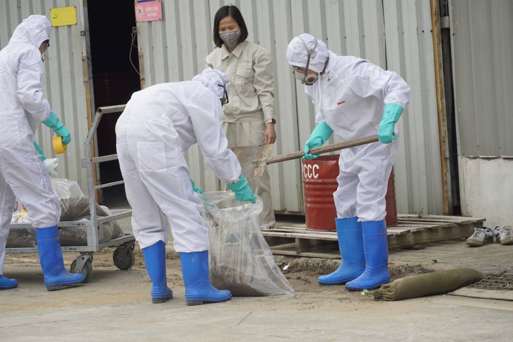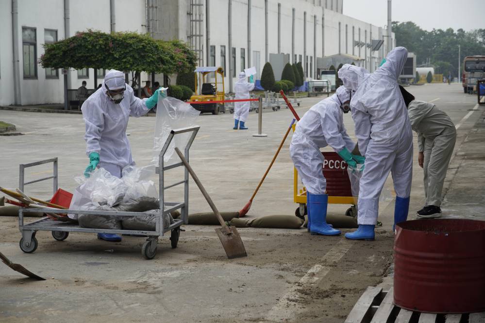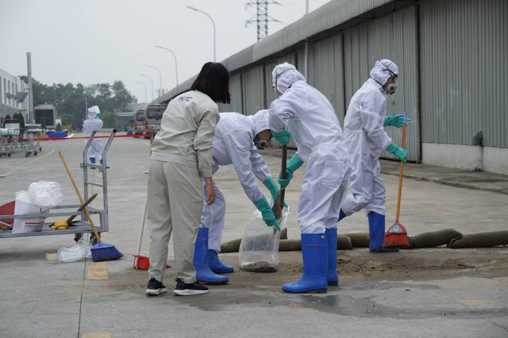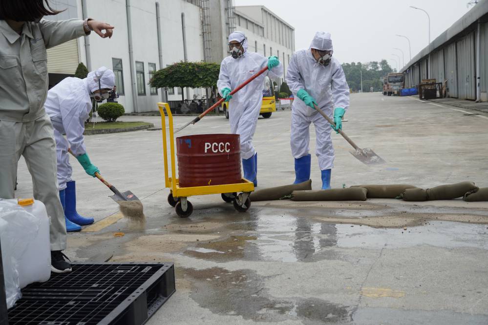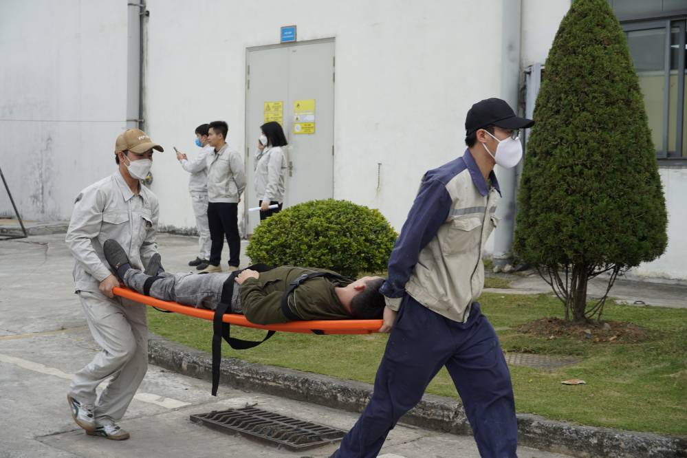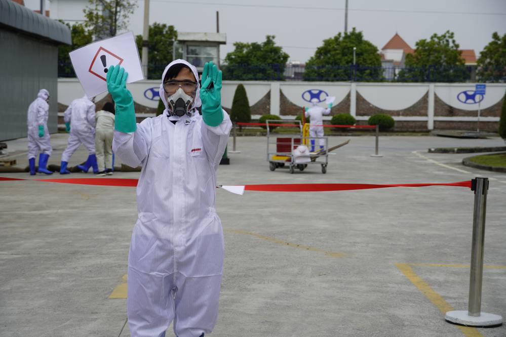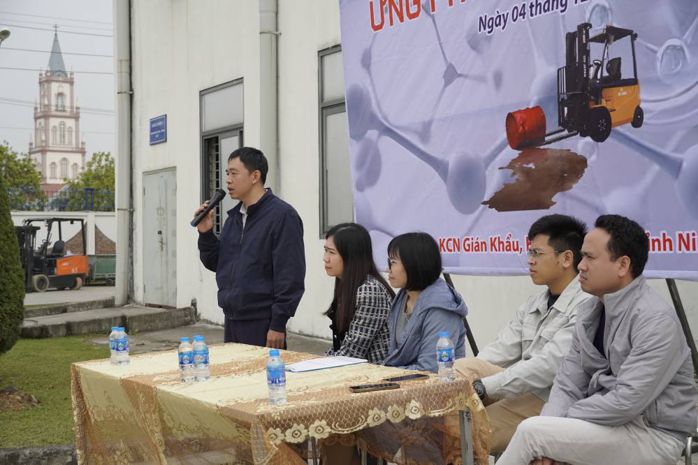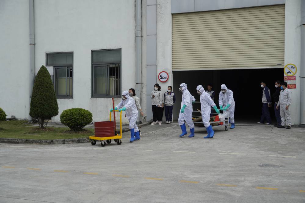 Buổi đào tạo và diễn tập ƯPSCHC được tổ ở bên ngoài xưởng Sơn. Nội dung buổi diễn tập mô tả tình huống sự cố tai nạn gây tràn đổ hóa chất trên đường vận chuyển. Khi tình huống giả định có sự cố xảy ra, ngay lập tức đội ƯPSC của công ty đã có mặt kịp thời, khoanh vùng khu vực, sơ cấp cứu cho người bị nạn; và tiến hành khắc phục sự cố tràn đổ.