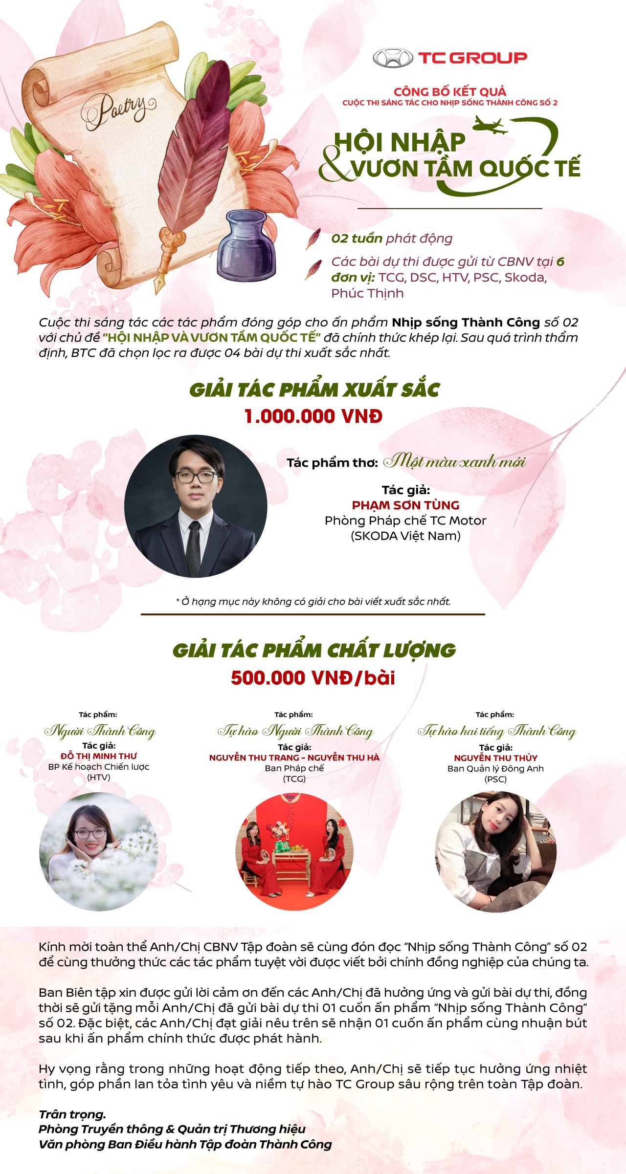 Anh/Chị hãy chờ đợi và đón đọc ấn phẩm “Nhịp sống Thành Công” số 02 khi chính thức được phát hành để cùng thưởng thức những tác phẩm thơ ấn tượng đã được chắp bút từ chính những đồng nghiệp của chúng ta!