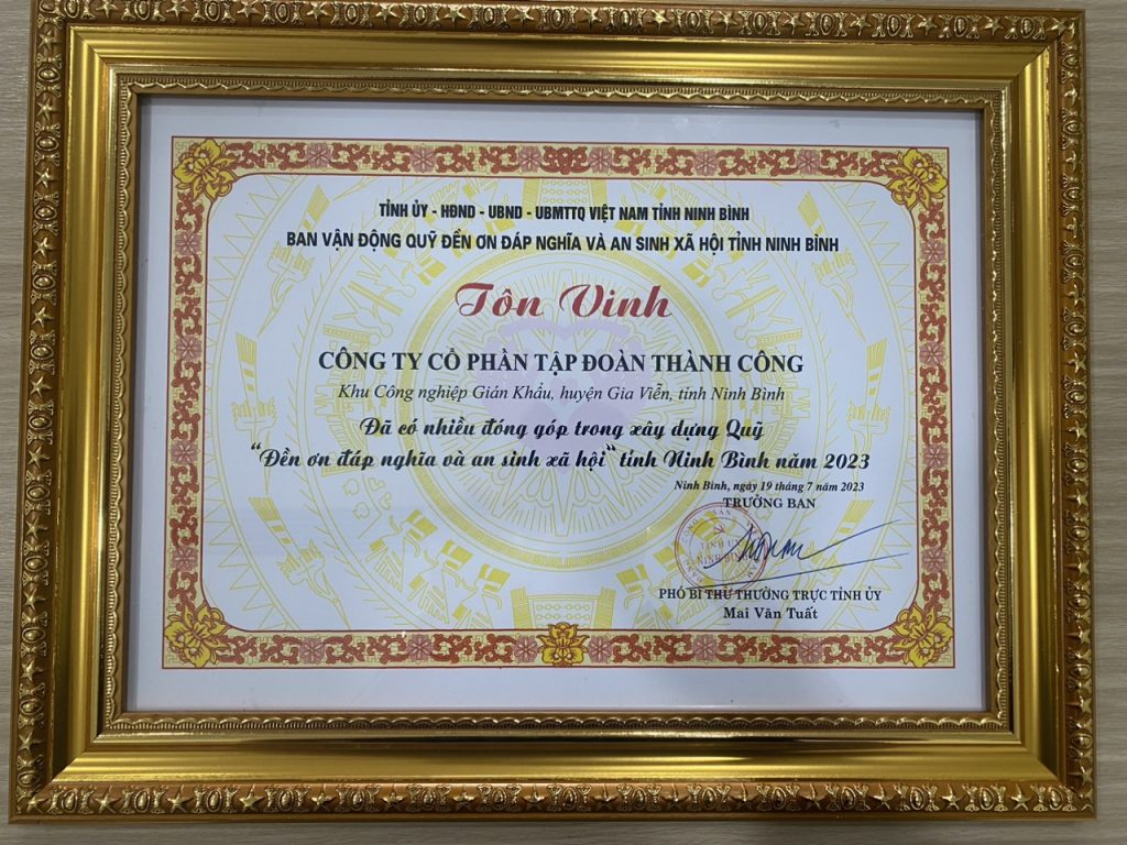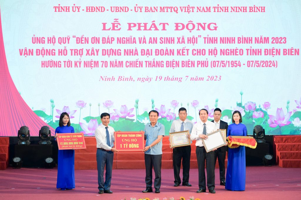 Ngày 19/7, Tập đoàn Thành Công đã tham dự Lễ phát động ủng hộ Quỹ “Đền ơn đáp nghĩa và an sinh xã hội” tỉnh Ninh Bình năm 2023; vận động hỗ trợ xây dựng nhà đại đoàn kết cho hộ nghèo tỉnh Điện Biên, hướng tới kỷ niệm 70 năm Chiến thắng Điện Biên Phủ (7/5/1954 – 7/5/2024) và ủng hộ Quỹ 1 tỷ đồng.